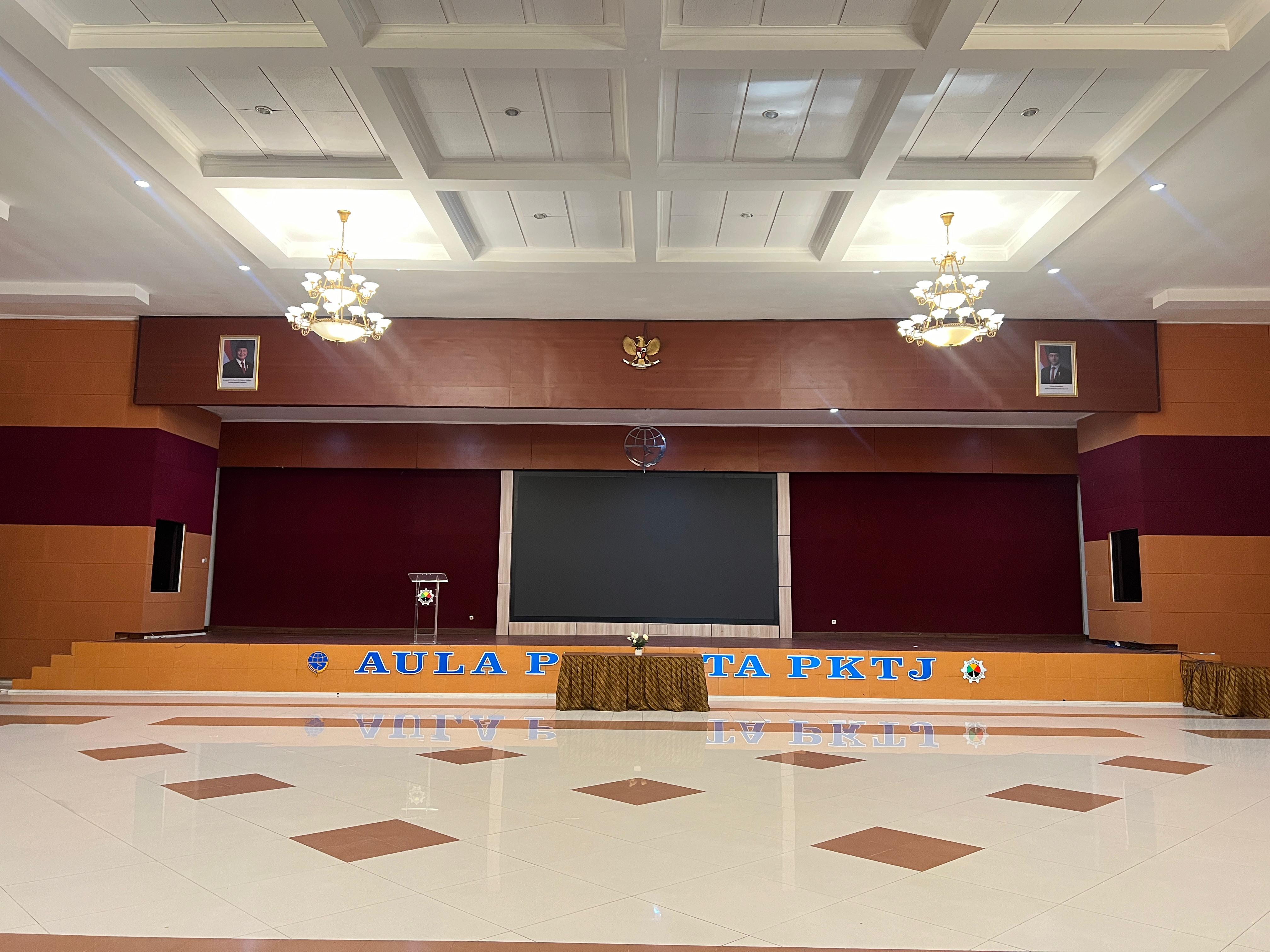 Aula Puspita PKTJ merupakan ruangan serbaguna yang luas, nyaman, dan representatif. Aula ini digunakan untuk berbagai kegiatan seperti seminar, rapat, pelatihan, hingga acara resmi kampus. Selain itu, Aula Puspita juga dapat digunakan untuk acara pernikahan karena memiliki kapasitas ruang yang besar. Fasilitas aula dilengkapi dengan pendingin ruangan (AC), panggung utama yang luas, serta penerangan yang elegan dengan lampu gantung. Lantai keramik yang bersih dan desain interior modern memberikan kesan megah dan formal, menjadikan Aula Puspita tempat yang ideal untuk berbagai kegiatan, baik akademik maupun acara sosial seperti resepsi pernikahan.